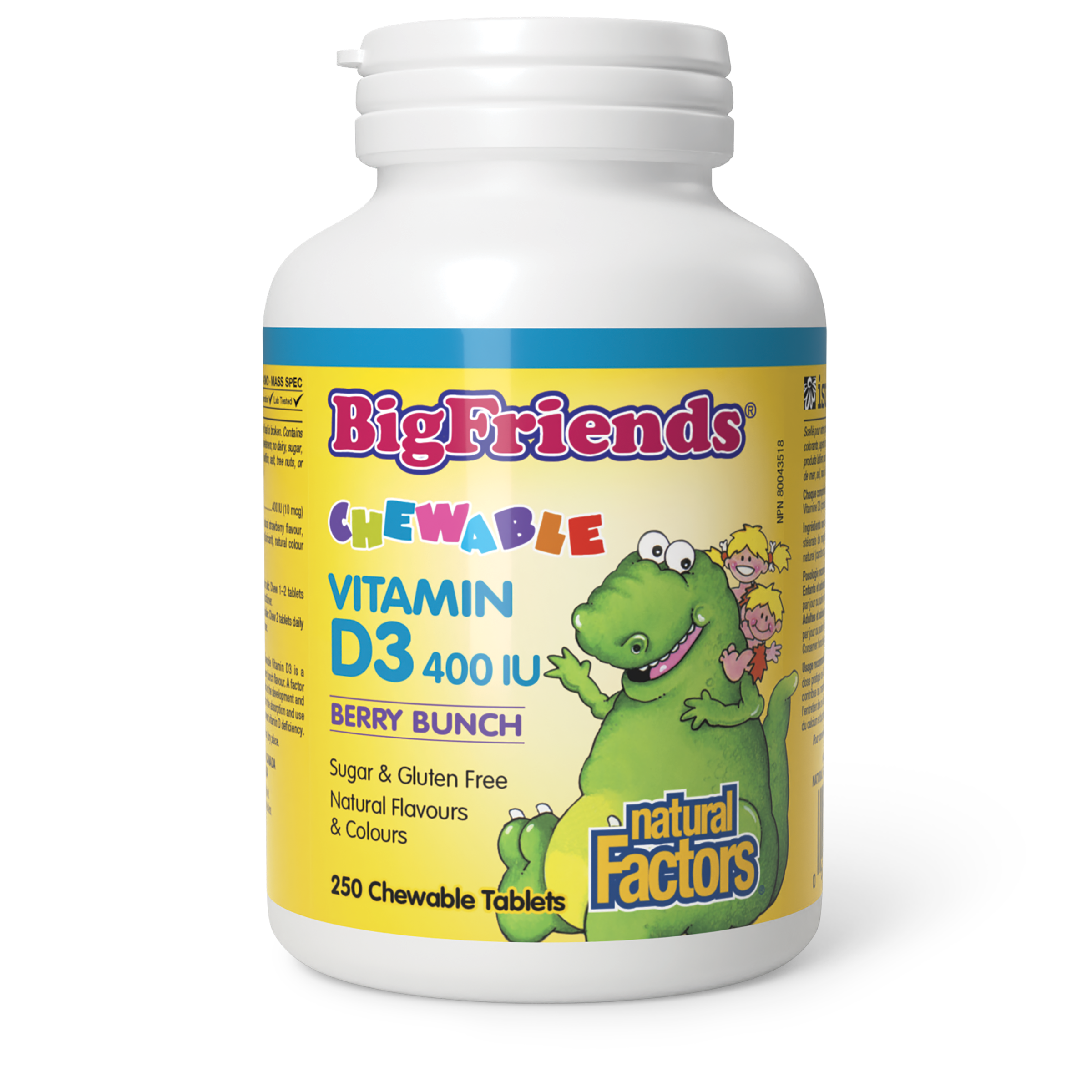Big Friends children ‘s vitamins are back in a big way, and now better than ever. Big Friends Chewable Vitamin D3 400 IU from Natural Factors is a great-tasting, natural source of the ‚Äúsunshine vitamin‚ , essential for building strong, healthy bones and teeth. Ideal for all children, these small, chewable tablets support calcium and phosphorus absorption, and make it fun and easy to support growing children.